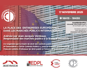 Jean-Jacques VERDEAUX, responsable des march¨¦s publics ¨¤ la Banque mondiale, interviendra sur ce sujet passionnant qui traitera de la concurrence dans les march¨¦s publics internationaux et de la place qu'occupent les entreprises europ¨¦ennes face aux autres entreprises ¨¦trang¨¨res (hors UE).